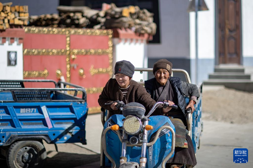 1月5日,定日縣長所鄉(xiāng)森嘎村村民面帶笑容,騎三輪車出行。新華社記者 姜帆 攝