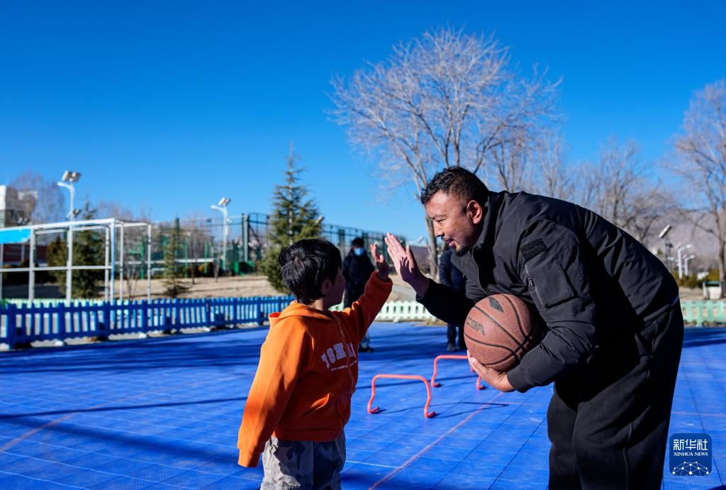 1月22日,在拉薩市全民健身體彩公園,“陽(yáng)光殘障兒童公益興趣班”教師土旦格桑(右)在體適能訓(xùn)練課程間隙與一名殘障兒童擊掌。新華社記者 丁增尼達(dá) 攝