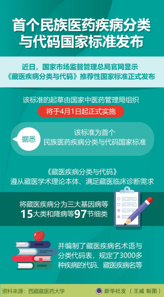 近日,國家市場(chǎng)監(jiān)督管理總局官網(wǎng)顯示《藏醫(yī)疾病分類與代碼》推薦性國家標(biāo)準(zhǔn)正式發(fā)布。記者從參與起草的西藏藏醫(yī)藥大學(xué)了解到,該標(biāo)準(zhǔn)的起草由國家中醫(yī)藥管理局組織,將于4月1日起正式實(shí)施。據(jù)悉,該標(biāo)準(zhǔn)為首個(gè)民族醫(yī)藥疾病分類與代碼國家標(biāo)準(zhǔn)。