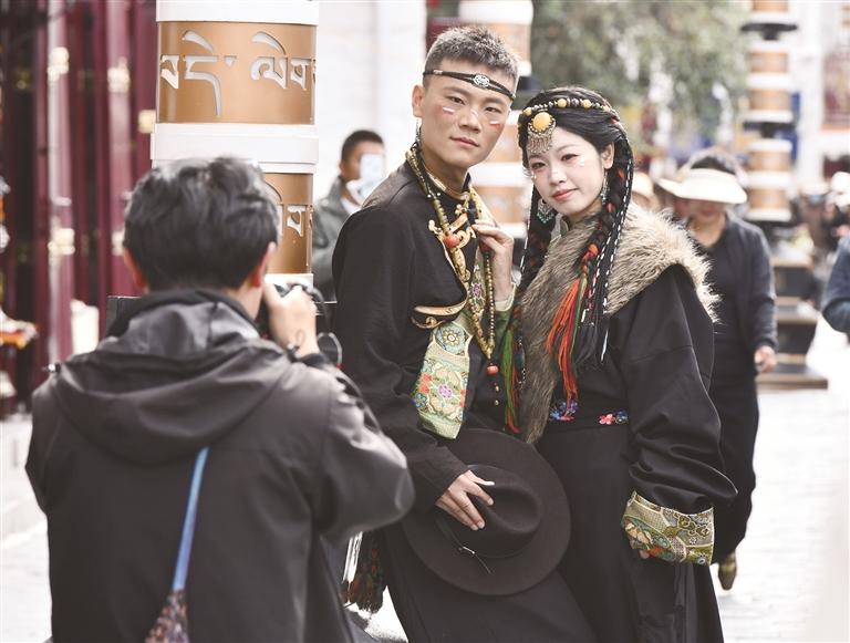 游客穿著藏裝在八廓街拍攝寫真。西藏日?qǐng)?bào)記者 旦增蘭澤 攝