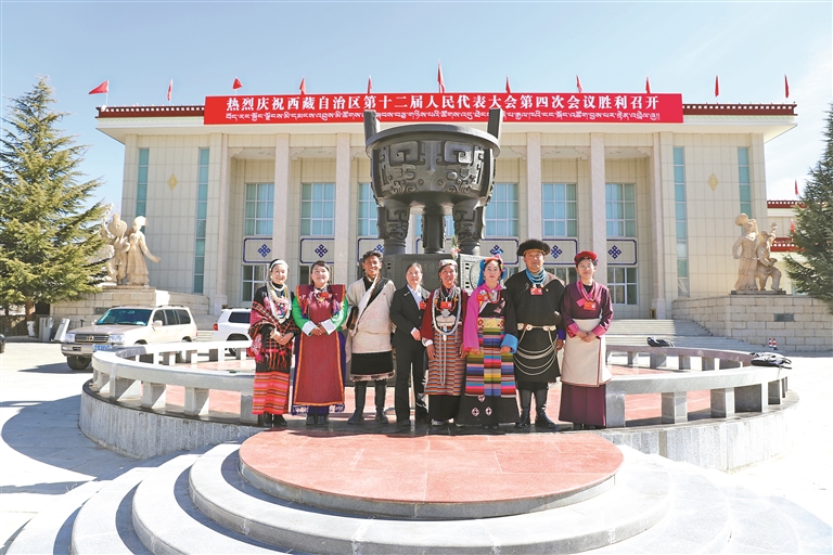 1月31日,來自7個民族的8位自治區(qū)人大代表,相“約”來到民族團結寶鼎前,暢聊民族團結進步事業(yè)并合影,大家相約來年再聚。左起:玉珍(僜人)、次仁普只(門巴族)、加凳(藏族)、成海宏(漢族)、仁增(夏爾巴人)、仁青措珍(納西族)、達娃(珞巴族)、斗卓瑪(門巴族)。 西藏自治區(qū)人大宣傳中心 德吉曲珍 徐亮 攝