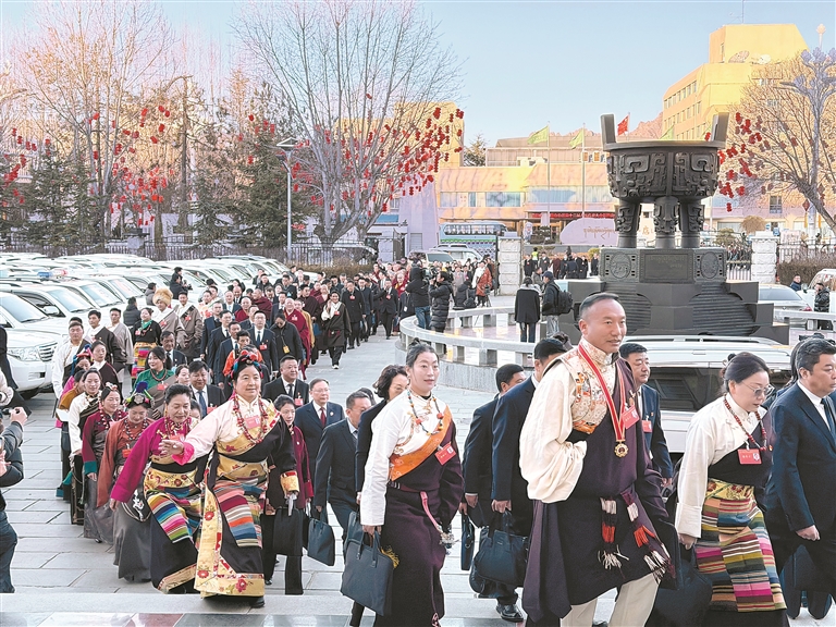 身著民族服飾的自治區(qū)人大代表步入會場。記者 次旦央吉 攝