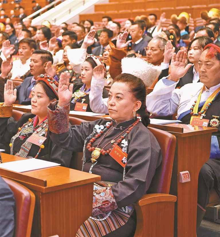 人大代表們舉手表決各項決議草案。記者 洛桑 攝