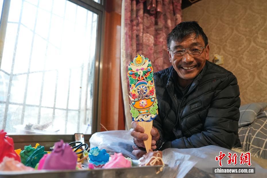 2月4日,隨著藏歷新年臨近,拉薩街頭年味漸濃,年貨市場上的“孜扎”迎來熱銷。酥油花藏語稱“孜扎”,是藏歷新年吉祥物切瑪盒的重要組件,也是藏族民眾家中必備的年貨。酥油花以酥油為主要原料,由匠人純手工捏制而成,造型涵蓋佛像、人物、花卉樹木、飛禽走獸等,常見圖案包含吉祥八寶、和諧四瑞、長壽圖等,承載著藏族民眾對(duì)新年平安吉祥、萬事順?biāo)斓拿篮闷碓?。圖為手工藝人展示制作完成的酥油花。貢確 攝