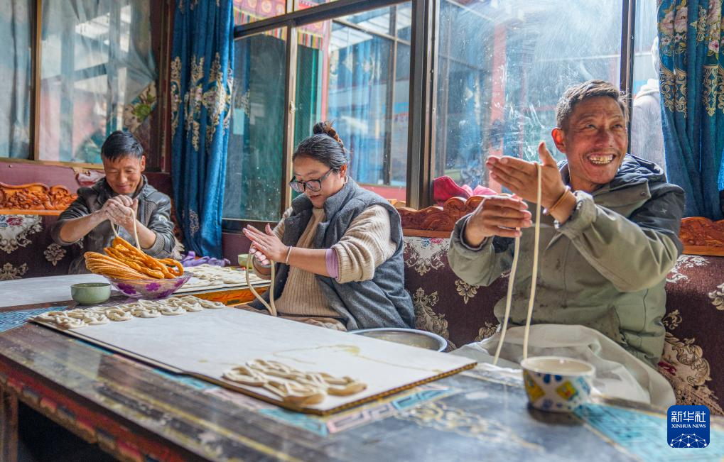 2月5日,玉麥鄉(xiāng)村民在家里做卡塞(一種傳統(tǒng)油炸面食),迎接即將到來的藏歷新年。新華社記者 丁增尼達(dá) 攝