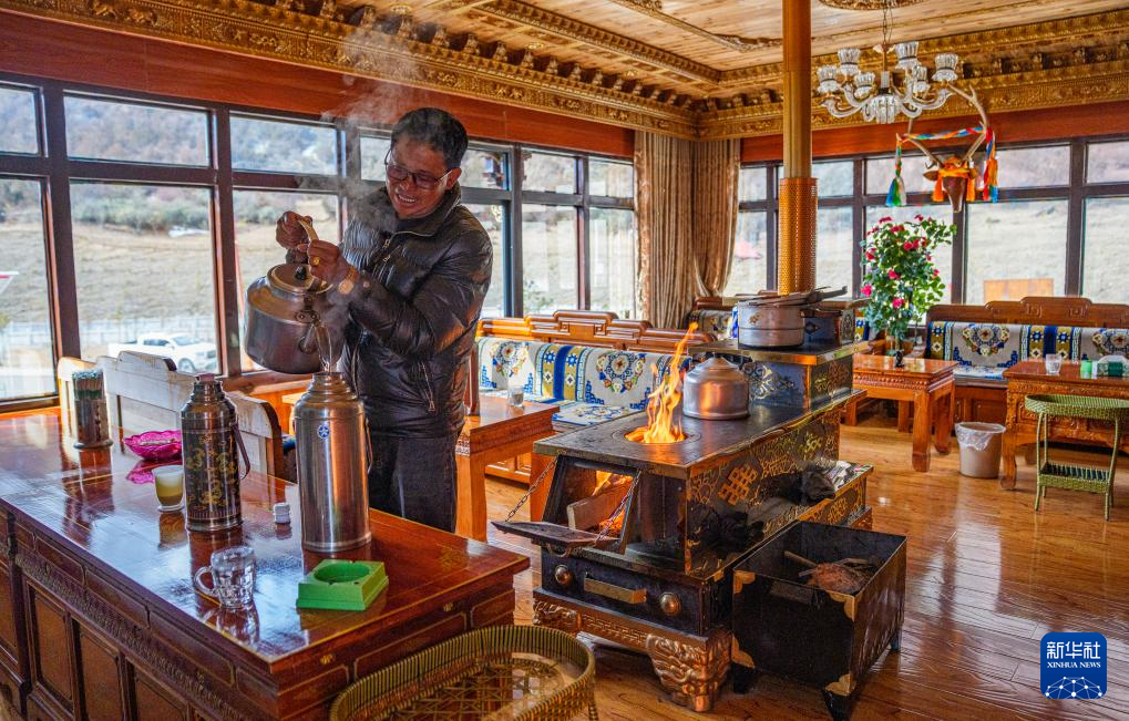 2月5日,玉麥鄉(xiāng)村民旺慶在自家經(jīng)營的民宿里灌開水。新華社記者 丁增尼達(dá) 攝