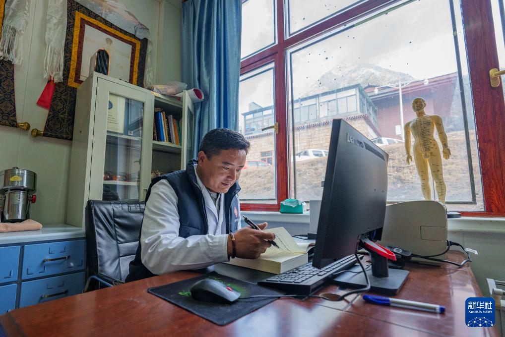 2月5日,玉麥鄉(xiāng)衛(wèi)生院醫(yī)生次旦米久在辦公室研讀藏醫(yī)書籍。新華社記者 丁增尼達(dá) 攝