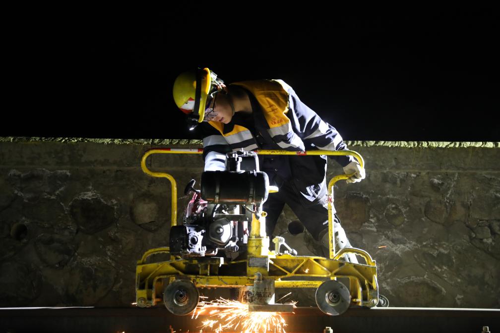 2月11日,日喀則線路工區(qū)職工正在用打磨機打磨鋼軌焊縫。(拉巴次仁 攝)
