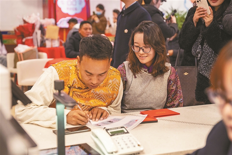 圖為新人在填寫(xiě)登記所需信息。記者 貢曲羅杰 攝