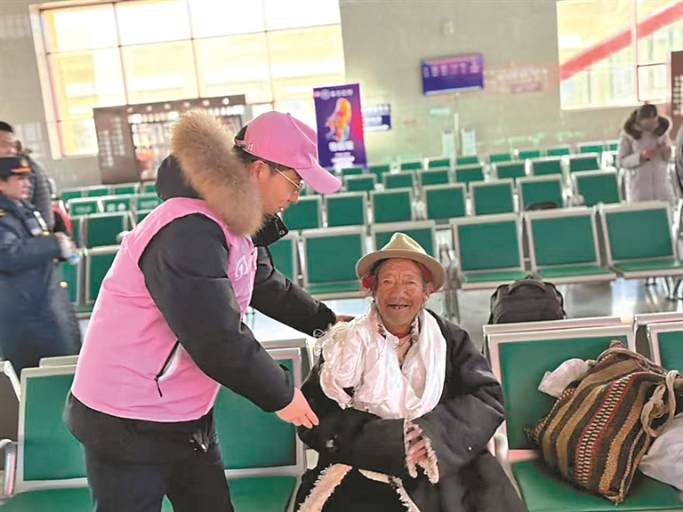 圖為在中國鐵路青藏集團有限公司拉薩車務(wù)段日喀則站內(nèi),“小花朵青年志愿服務(wù)隊”志愿者在為旅客提供服務(wù)。記者 鹿麗娟 攝