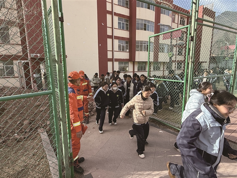 指戰(zhàn)員現(xiàn)場組織開展地震應(yīng)急疏散演練。圖由卡若區(qū)消防救援機(jī)動(dòng)大隊(duì)提供