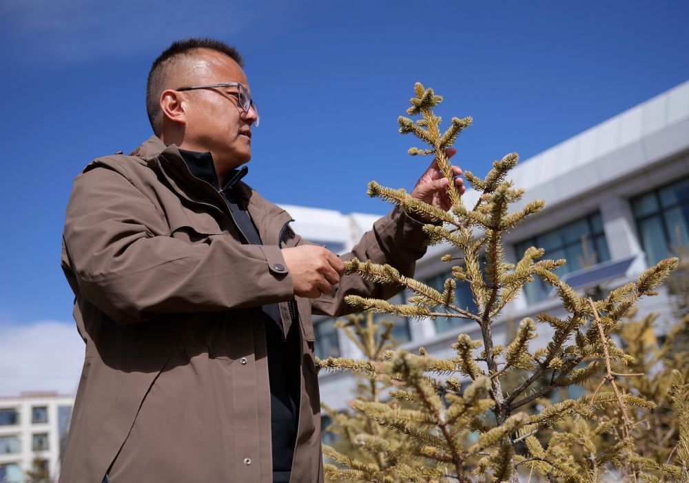 3月20日上午10點(diǎn)30分,扎西像往常一樣來到市科技局的院子里,仔細(xì)查看樹木的長(zhǎng)勢(shì)。他彎腰伸手,摸了摸樹的葉子和枝條,又踩了踩樹下的土壤。“越冬情況總體穩(wěn)定,也有了返青跡象,可以開始澆水、施肥了?!痹餍老驳卣f。
