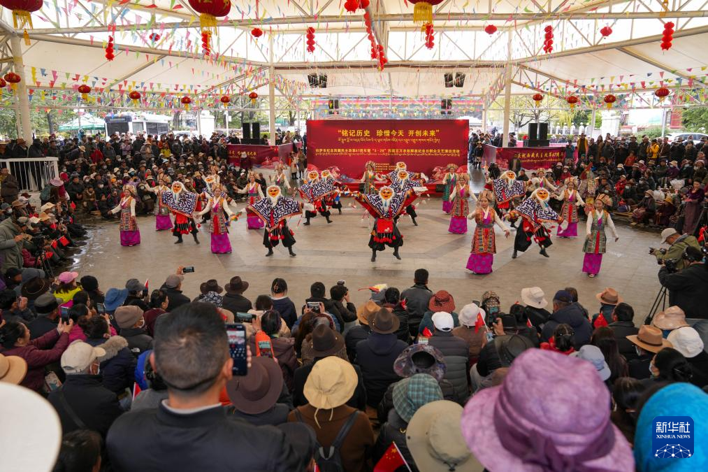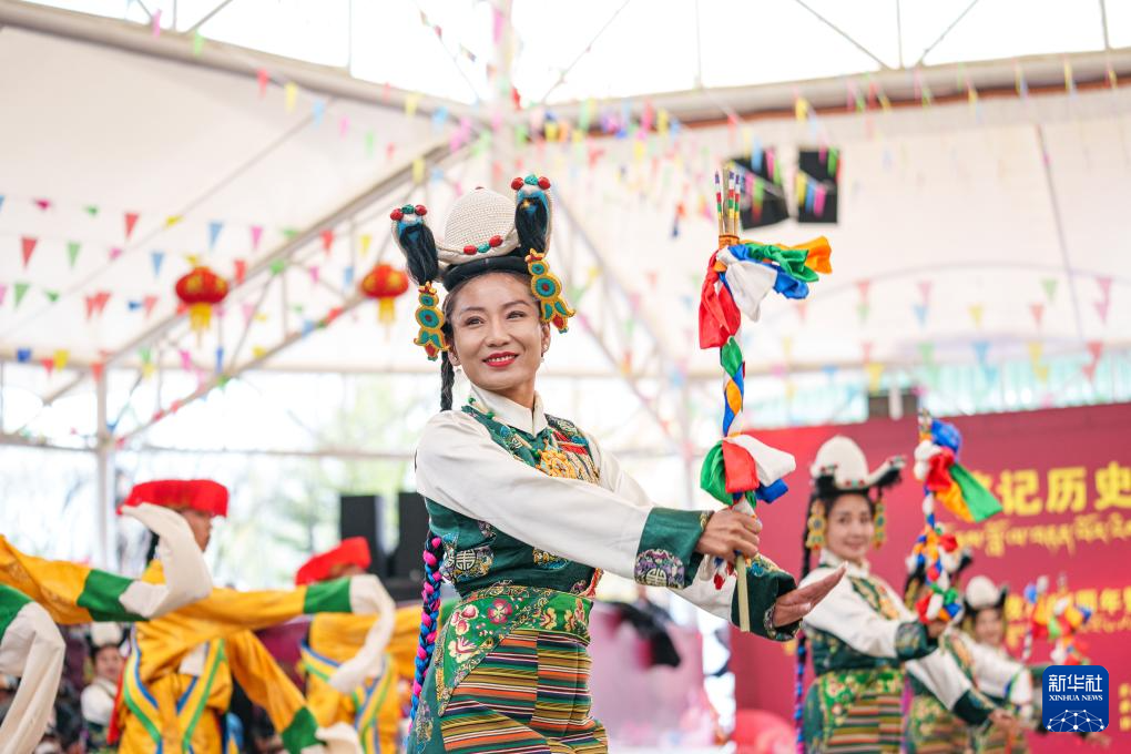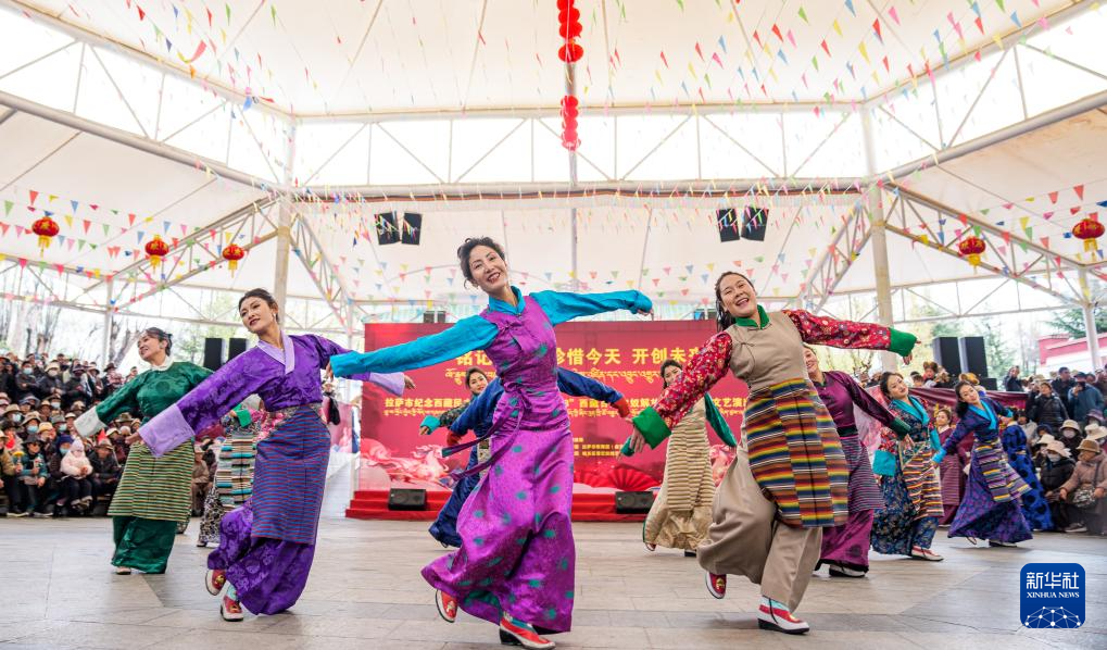 3月28日,演員在拉薩市宗角祿康公園內(nèi)舉辦的西藏百萬農(nóng)奴解放紀(jì)念日群眾文藝演出活動上載歌載舞。新華社記者 晉美多吉 攝