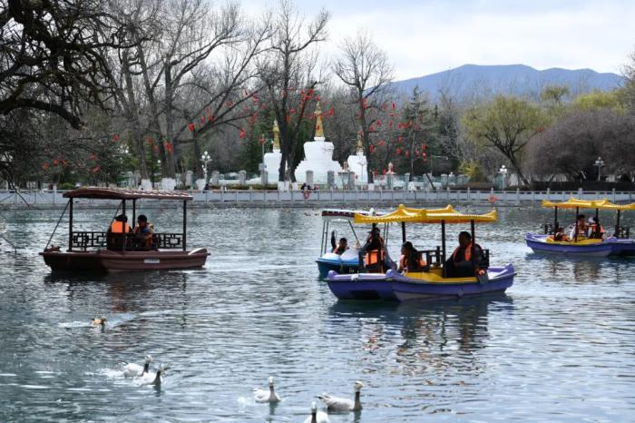 3月8日,西藏拉薩宗角祿康公園,市民乘游船賞春。古城拉薩楊柳發(fā)芽、桃花初放,春意漸濃。