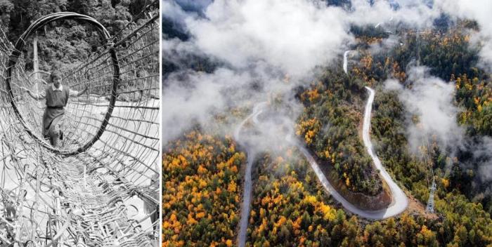 拼版照片:左圖是墨脫縣雅魯藏布江上的藤橋(20世紀80年代資料照片,新華社記者 顧綬康 攝);右圖是2020年11月5日拍攝的派墨公路米林段公路。新華社發(fā)
