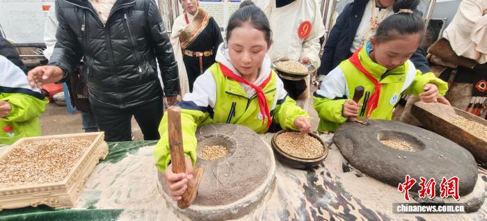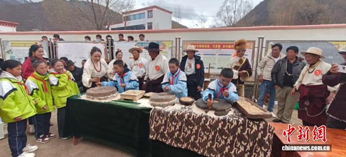 圖為俄洛鎮(zhèn)賽事活動中組織學(xué)生體驗傳統(tǒng)磨糌粑技能。卡若區(qū)融媒體中心 供圖