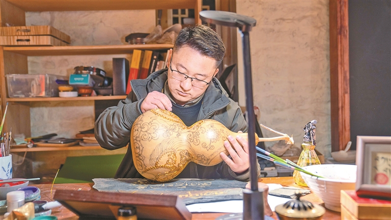 就像做掐絲葫蘆,他會先有線稿,但最終會根據(jù)葫蘆本身的形狀與色澤,讓唐卡圖案與掐絲紋樣在制作中相互調(diào)整、逐步呈現(xiàn)?!熬拖癫菰系暮?,它有它的流向,你只需順著它的流勢,稍加引導(dǎo)就好?!边@種“因材施藝、順勢而為”的創(chuàng)作態(tài)度,讓他的作品既有手作的溫度,又透著一股生動的自由。