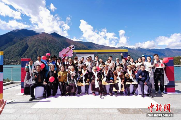 圖為新人們?cè)诨顒?dòng)現(xiàn)場(chǎng)留影。林芝市民政局供圖