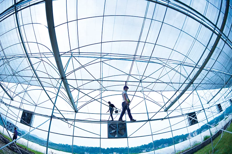 近年來,湖北省恩施土家族苗族自治州宣恩縣大力發(fā)展“設施農業(yè)”,通過企業(yè)、合作社、家庭農場等將農民手中的土地進行流轉,發(fā)展農業(yè)觀光園和生態(tài)采摘園,為當?shù)剞r民開辟一條產業(yè)脫貧的新路。圖為宣恩縣李家河鎮(zhèn)二虎寨村,工人們在搭建溫控大棚。 新華社記者 宋文/攝