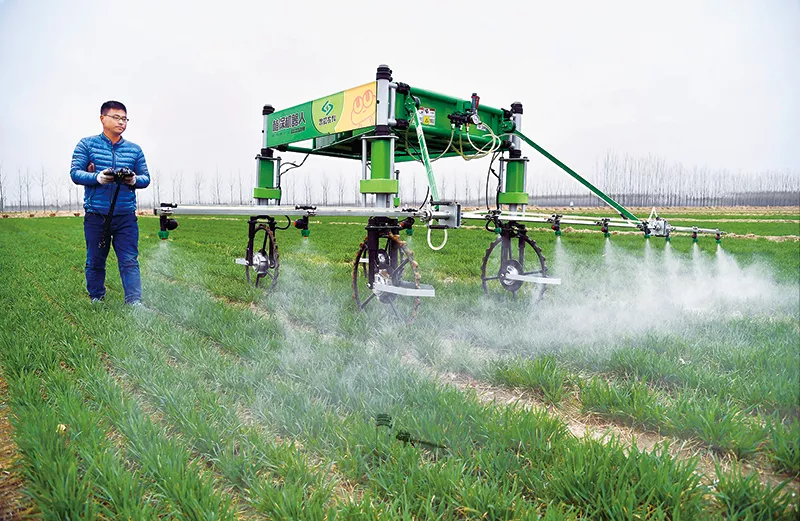 實施鄉(xiāng)村振興戰(zhàn)略,必須破除人才瓶頸制約。記者在山東壽光、滕州、鄒平等地看到,很多外出求學、打工、創(chuàng)業(yè)多年的年輕人,帶著新的理念和技術回到農村,成為希望田野上的職業(yè)農民。圖為2018年3月20日,鄒平縣明集鎮(zhèn)年輕的職業(yè)農民在操作植保機器人噴施農藥。 新華社記者 郭緒雷/攝