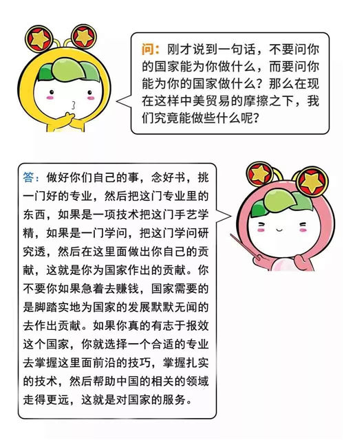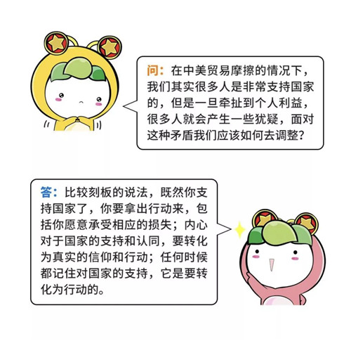 面對短期的困難和波動,青年人要清楚“美國在貿(mào)易戰(zhàn)中提出的要價,不是小打小鬧”,應該堅定立場,“抗爭到底”,也要“風物長宜放眼量”,避免局限于眼前的小確幸,被暫時的挫折和困難所擊倒,要有與國家民族的發(fā)展同方向的扎實的行動,在實踐中實現(xiàn)自我價值。
