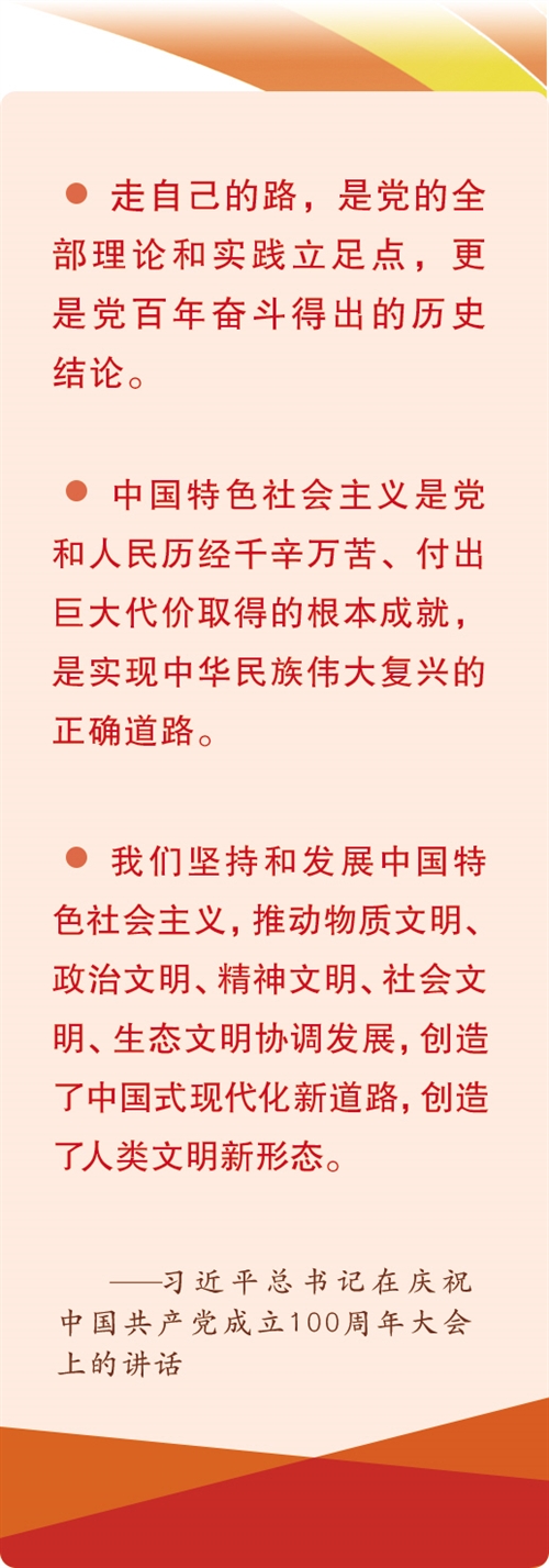 習近平總書記在慶祝中國共產(chǎn)黨成立100周年大會上強調(diào),“以史為鑒、開創(chuàng)未來,必須堅持和發(fā)展中國特色社會主義”“我們堅持和發(fā)展中國特色社會主義,推動物質(zhì)文明、政治文明、精神文明、社會文明、生態(tài)文明協(xié)調(diào)發(fā)展,創(chuàng)造了中國式現(xiàn)代化新道路,創(chuàng)造了人類文明新形態(tài)”。