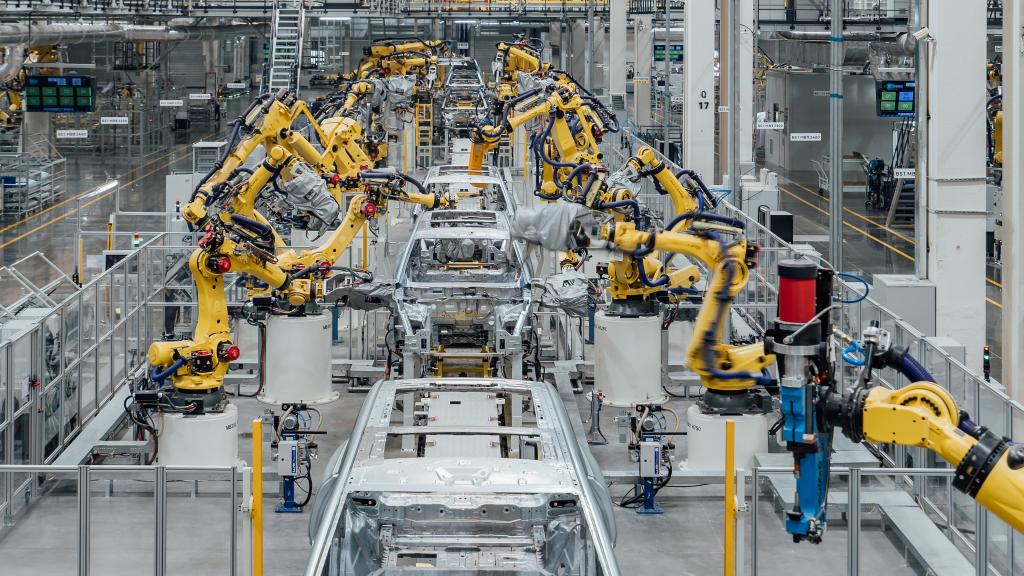 2024年2月26日在重慶市兩江新區(qū)拍攝的賽力斯汽車超級工廠焊裝車間生產(chǎn)線(無人機照片)。新華社發(fā)