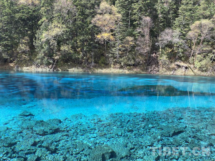 圖為五花海,由于海底的鈣華沉積、各種色澤艷麗的藻類以及岸邊五彩斑斕的林木倒影,使得五花海呈現(xiàn)出鵝黃、藏青、墨綠、寶藍等顏色,故稱“五花海”,素有“九寨精華”之譽