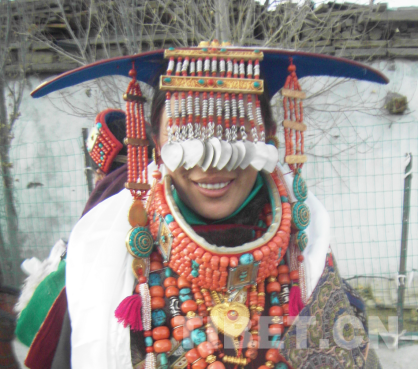 在科迦村,幾乎家家有一套世代相傳的飛天服飾,服飾的掛飾以及頭飾中都不能少了綠松石、蜜蠟和珊瑚。而真正懂飛天服飾、懂三種寶物的人,一眼便可以分辨出哪套服飾是其中的佼佼者。也就是說,通過服飾中所使用的寶物的成色可以分辨出服飾價(jià)值的大小。