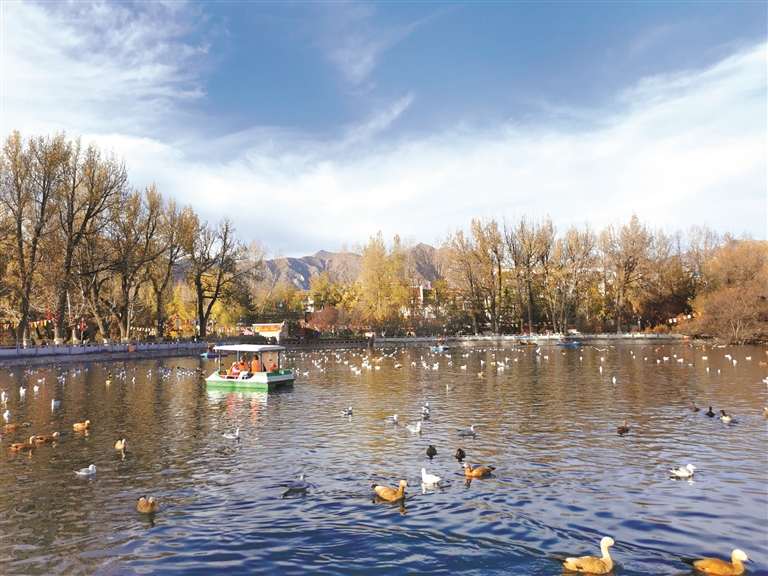 冬日的西藏拉薩市宗角祿康公園里,遠(yuǎn)山若描,游人如織,湖面上眾多前來(lái)越冬的水鳥盡情嬉戲。藍(lán)天白云碧水,呈現(xiàn)出一道生動(dòng)的冬日拉薩生態(tài)美景。[詳細(xì)] -