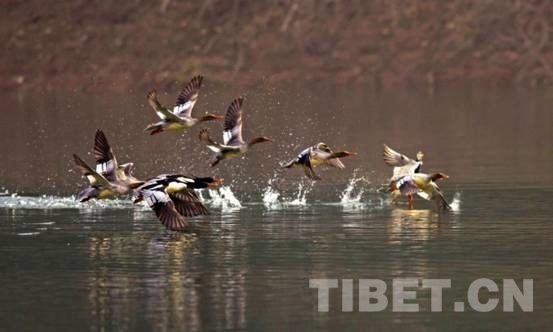 中國西藏網(wǎng)訊 漫步于湖南省常德市桃源縣沅水國家濕地公園,只見清澈的江面上點(diǎn)綴著沙洲,隨著江水的緩緩流動,魚群也輕快地游動。透過岸邊的望遠(yuǎn)鏡,能夠看到一群長著黑色頭部、紅色嘴巴、翅膀后勾勒有魚鱗狀斑紋的中華秋沙鴨正在此嬉戲。每年冬天,這群美麗生靈都會飛越大半個中國,相約在此度過漫長冬季。
