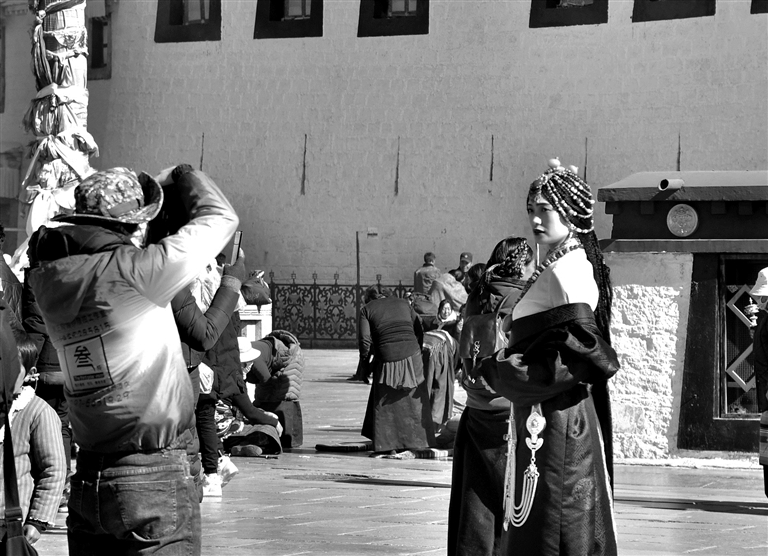 梳著彩辮,搖著轉(zhuǎn)經(jīng)筒,悠游名勝古跡,細(xì)細(xì)品味西藏氛圍,然后在八廓街古老的街道和庭院里拍一組西藏特色的藏裝照。隨著“冬游西藏”的熱度提升,來(lái)西藏游玩的游客也逐漸增多,在游玩的同時(shí)專(zhuān)門(mén)拍上一組濃郁地方特色的寫(xiě)真也成為眾多游客的選擇,許多攝影工作室因此客源不斷。 圖為12月11日,游客在拉薩老城區(qū)身著藏裝拍照。記者 梁梅 攝