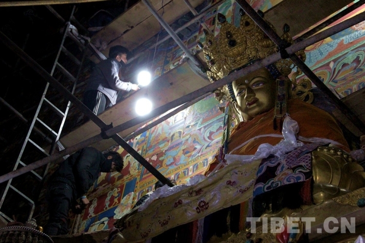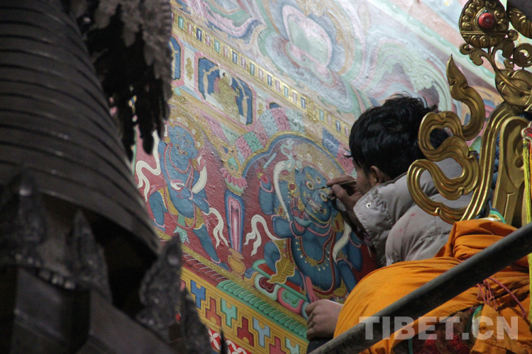 1320年,二世法臺鄔金貢布按照桑吉翁遺囑,邀請了尼泊爾藝術家雜雅、拉薩人貢唐巴·旺措蚌、多康·索朗本等人修建了查杰瑪大殿。大殿建成后尼泊爾藝術家在大殿底層內(nèi)壁及外廊、內(nèi)廊等墻面繪制了壁畫。幾百年來,當年極具尼泊爾藝術風格的壁畫已依稀斑駁,當?shù)卣M織了本地唐卡畫師對壁畫進行修復。圖為畫師們在大殿一層“花殿”內(nèi)修復壁畫 攝影:李元梅