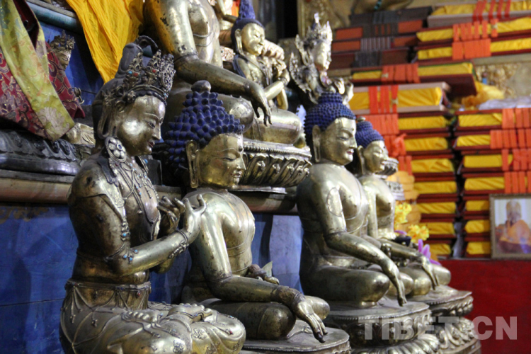 查杰瑪大殿內(nèi)供奉著金、銀、烏銅、檀香木等材料制作的4萬多件藏傳佛教造像,在大殿中,不經(jīng)意間就會與不少國家級文物和高僧大德的塑像相遇。圖為查杰瑪大殿二層“紅殿”內(nèi)供奉的釋迦牟尼佛水印像,相傳為釋迦牟尼在世時鑄造。 攝影:李元梅
