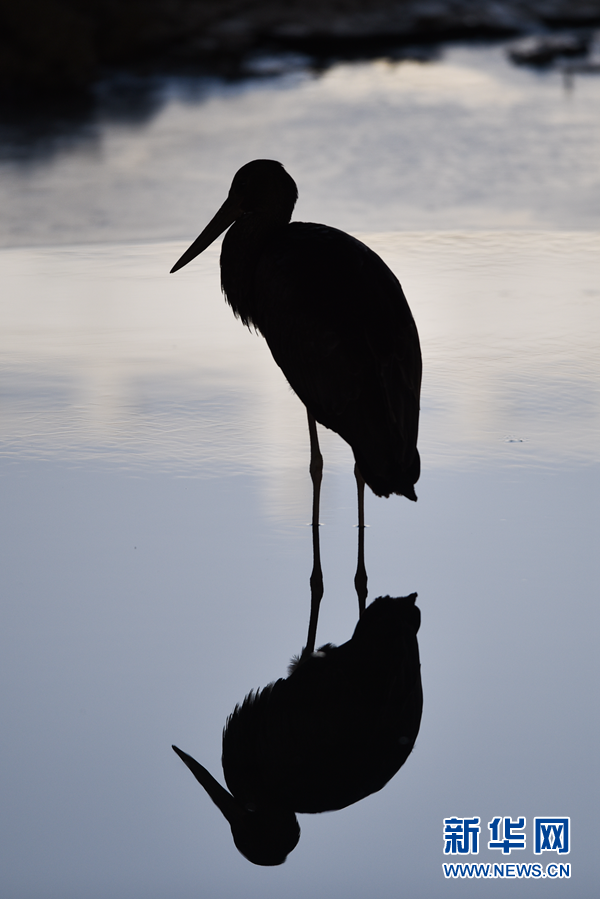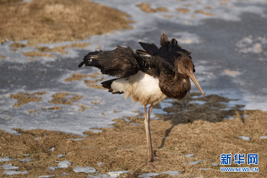 12月6日,一只黑鸛在西寧市北川河濕地公園內(nèi)整理羽毛。新華社記者 吳剛 攝