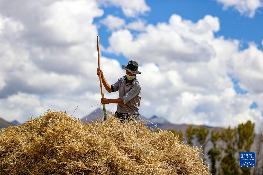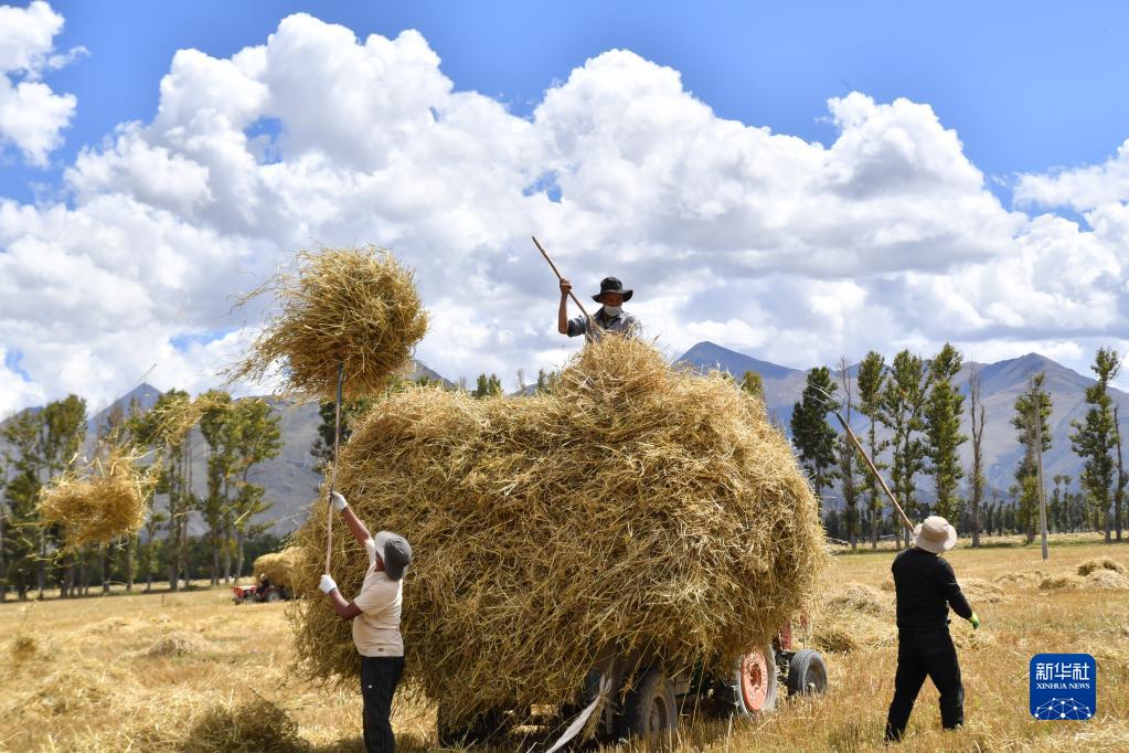 9月21日,拉薩市林周縣邊林鄉(xiāng)當杰村的村民在收集秸稈。新華社記者 姜帆 攝