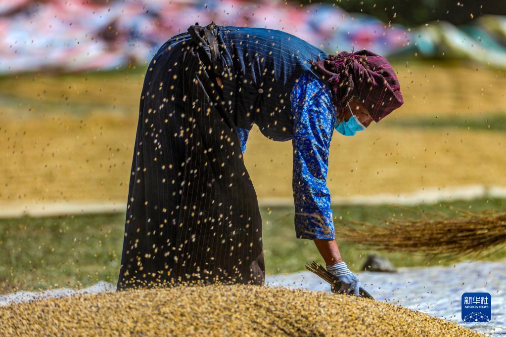 9月21日,拉薩市林周縣江熱夏鄉(xiāng)江夏村的村民在揚場。新華社記者 姜帆 攝
