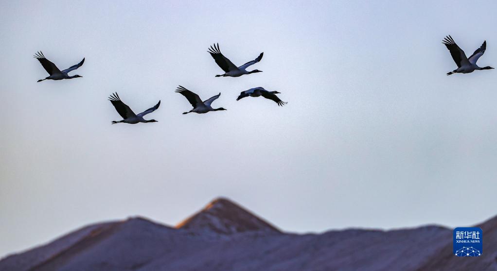 黑頸鶴群飛過林周縣強(qiáng)嘎鄉(xiāng)境內(nèi)山梁(11月6日攝)。新華社記者 姜帆 攝
