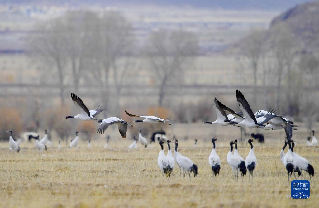 黑頸鶴在林周縣黑頸鶴自然保護(hù)區(qū)上空盤旋(11月6日攝)。新華社記者 張汝鋒 攝