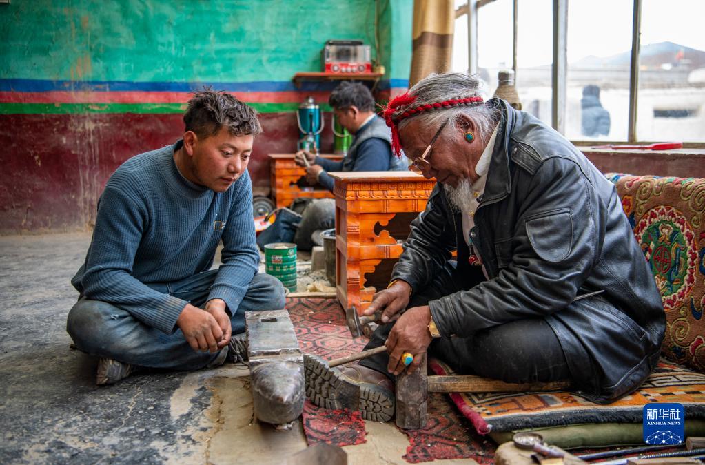 次旦旺加(右)在指導孫子制作藏刀(3月17日攝)。新華社記者 孫非 攝