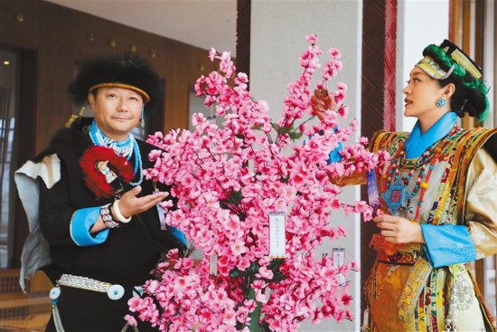 圖為推介會現(xiàn)場,工作人員對民族服飾進(jìn)行展示。記者 格桑倫珠 李梅英 攝