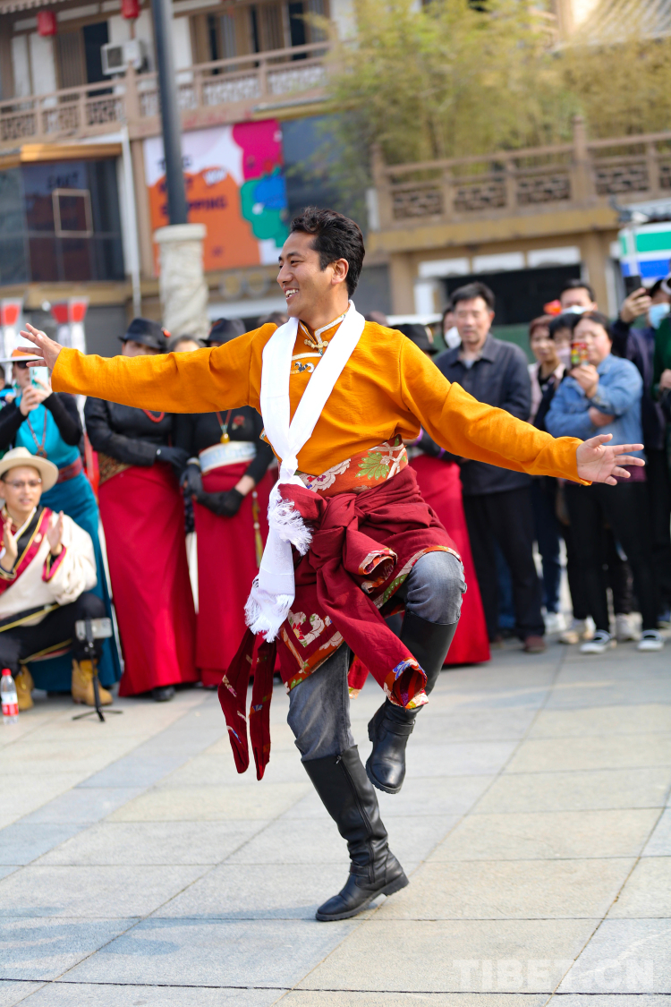 圖為大唐西市活動(dòng)現(xiàn)場(chǎng) 多杰尼瑪正在領(lǐng)舞 攝影:呂靜
