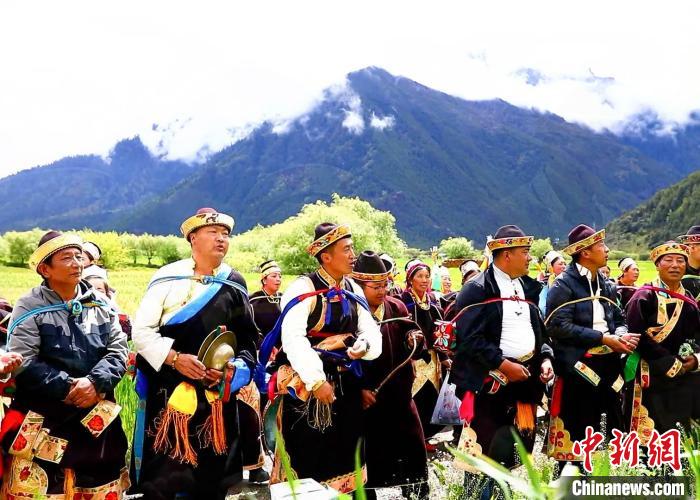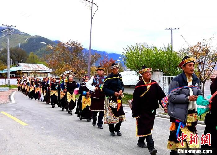 圖為村民背上經(jīng)文繞田?!∴嚢?攝