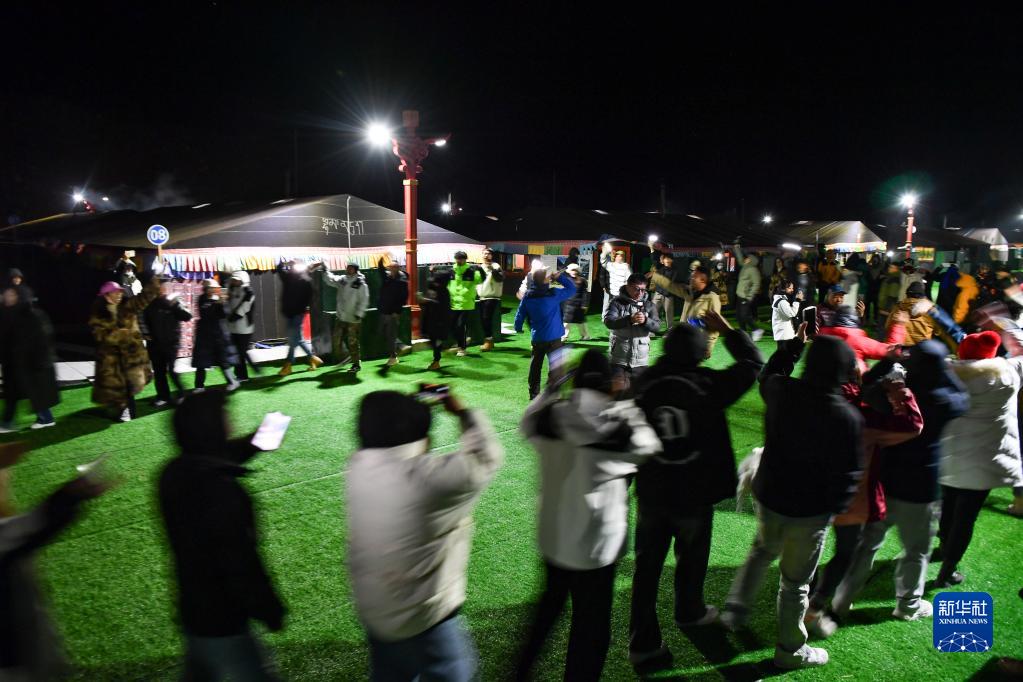 在珠峰游客大本營,游客在帳篷旅館間的空地上唱歌跳舞(5月16日攝)。新華社記者 晉美多吉 攝