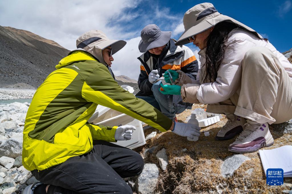 在珠峰登山大本營附近,科考人員檢測絨布冰川末端水質(zhì)(5月14日攝)。新華社記者 孫非 攝