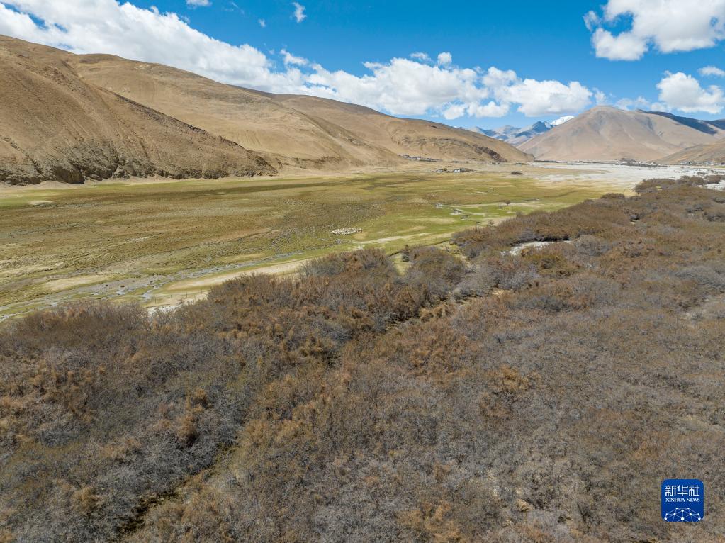 這是在珠峰國家級自然保護區(qū)內拍攝的沙棘林和濕地(5月25日攝,無人機照片)。新華社記者 孫非 攝