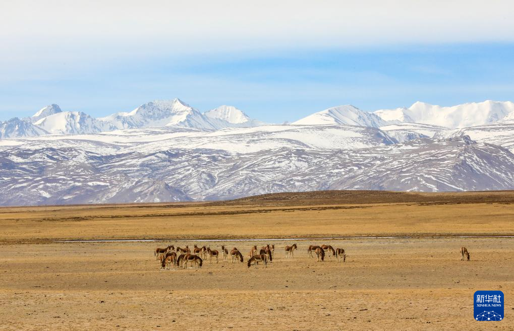 3月29日,藏野驢在西藏阿里地區(qū)普蘭縣境內(nèi)納木那尼峰下覓食。新華社發(fā)(劉曉東攝)
