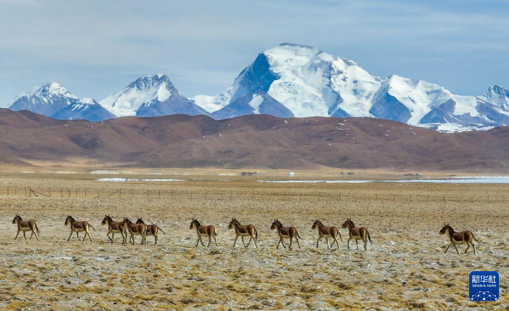 3月29日,藏野驢在西藏阿里地區(qū)普蘭縣境內(nèi)雪山下奔跑(無人機(jī)照片)。新華社發(fā)(劉曉東攝)