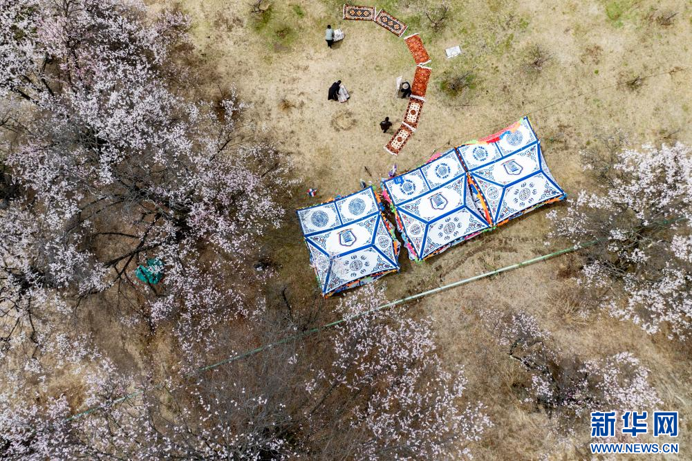 4月3日,群眾在林芝市巴宜區(qū)嘎拉村桃花間準備 “過林卡”(無人機照片)。新華網(wǎng) 旦增努布 攝