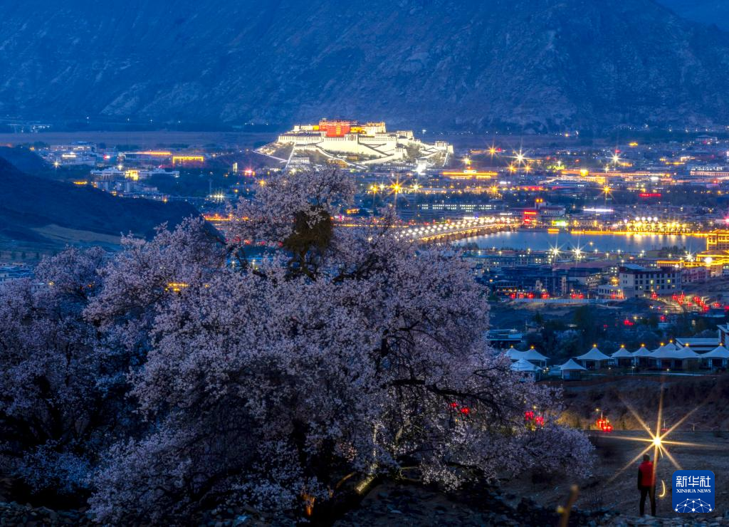 夜色中桃花映襯著布達(dá)拉宮(4月16日攝)。新華社記者 姜帆 攝